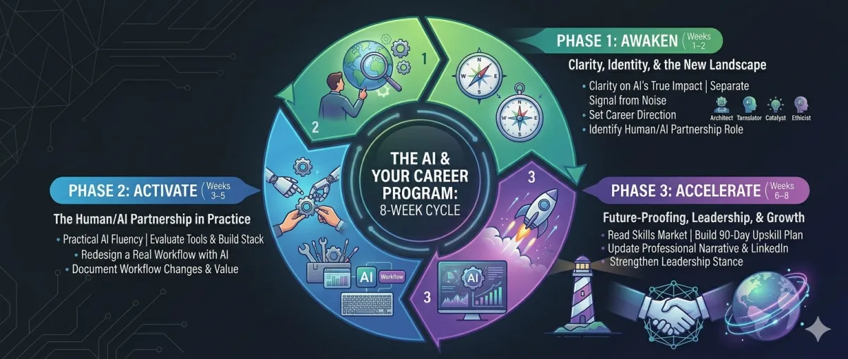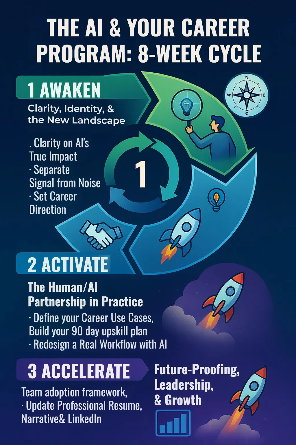 An 8-week live program for professionals who want to build AI confidence, stay relevant, and create a clear career plan.